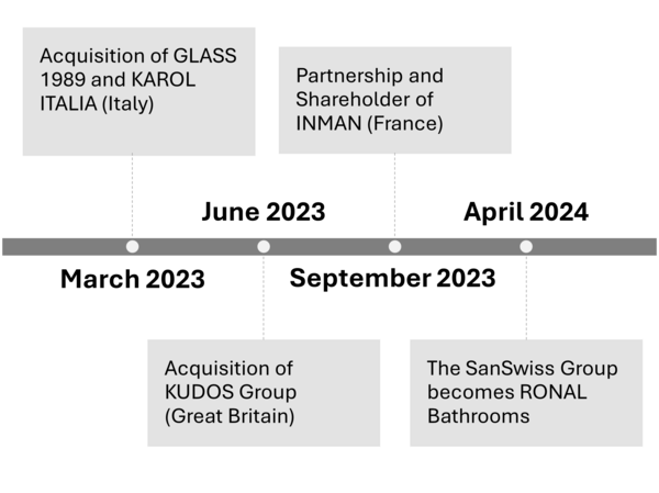 RONAL Bathrooms, naujas Šveicarijos RONAL GROUP vonios kambarys ir sveikatingumo padalinys, kurio būstinė yra Härkingen/Gunzgen mieste, Šveicarijoje, išaugo iš buvusios SanSwiss grupės, kuri 2023 m. pradėjo dinamišką augimo trajektoriją su įvairiais įsigijimais ir partneryste santechnikos rinkoje.